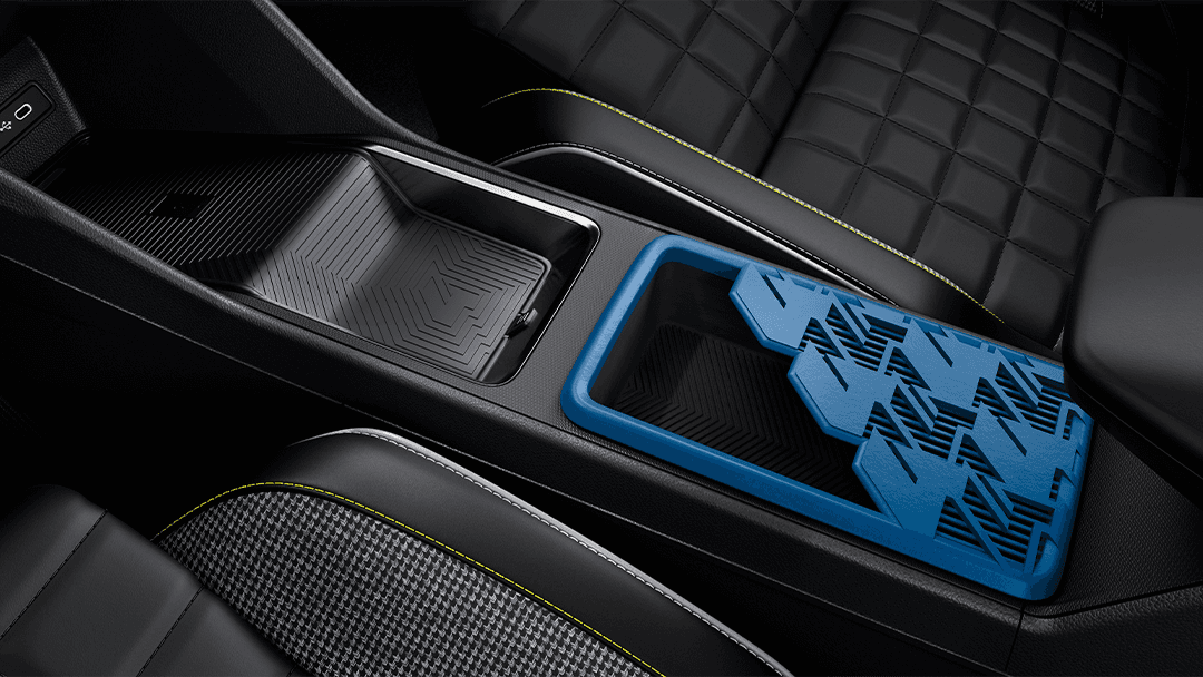 Gjør Renault 4 E-Tech electric til din egen! Det finnes et bredt utvalg av tilpasningsmuligheter, som for eksempel 3D-print@flins-tilbehør. Tilbehøret er produsert av Renault selv. Gjør bilen komplett med små og store sentrale oppbevaringsbokser eller velg din egen e-pop girknapp som passer perfekt til girspaken.